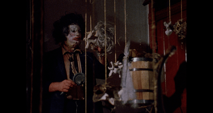 Dernière à intervenir dans le documentaire, Karyn Kusama s’attarde sur la dimension sociologique de Massacre: selon elle, la société a contracté une dette auprès des Hewitt depuis qu’ils se sont retrouvés au chômage (“they are owed their jobs back”) ; son analyse porte ensuite sur la notion de masculinité brisée ; elle explique que Leatherface, une sorte d’enfant déguisé, subit une pression considérable de par son rôle dans la chaîne de production (mais aussi, de manière méta, son rôle dans la production du film). Kusama démystifie la figure du serial killer en affirmant que Leatherface, non pas un monstre, est une partie de nous¹². L’incapacité de la famille Hewitt à se moderniser, dans une Amérique qui n’existe plus, est la source de la création d’un cauchemar, une réponse à un rêve américain qui, potentiellement, n’avait jamais existé à la base. Le paradoxe de Massacre réside également dans son articulation du temps qui passe avec des éléments plus mystiques: tandis que la date affichée au générique et que les informations diffusées à la radio ancrent le récit dans une forme de réalisme, le film, de manière universelle, tend à s’extraire de la temporalité pour étendre son propos à tout un chacun, nous qui à la vision du film nous retrouvons “marqué au fer rouge”, comme le bétail, par ce passage particulier du temps filmique. Le ressort à un dialogue sur l’astrologie (convocation du soleil et de la lune) est une stratégie payante usée par Hooper pour créer quelque chose de mythique, où l’Animus (instinct primaire) le dispute aux pulsions et aux déceptions. Dans sa peinture baconienne de l’horreur humaine, le réalisateur réussit à nous faire visualiser un paysage, une construction d’une certaine Amérique, dont le focus n’est pas tant les Américains, que cette terre hostile entachée par de nombreux massacres (les peuples Natifs). Le générique de début, avec son texte déroulant, est une première titillation envers le public, afin de créer un effet de réel (“une histoire vraie”). Le montage flash sur des cadavres en décomposition a pour but de choquer in medias res. Le travelling descendant sur la sculpture cadavérique rejoint l’intention de Hooper de faire une “oeuvre d’art pleurnicharde” (« a grizzly work of art »), dans laquelle le soleil ne se lève que pour que nous puissions voir plus clairement le Mal. L’obsession pour les encadrures de portes sont un legs du cinéma d’Ingmar Bergman et d’Andrei Tarkovski.
