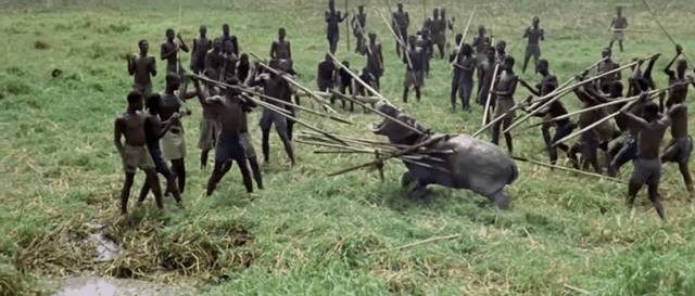 En un enchaînements de photogrammes Jacopetti et Prosperi mènent une comparaison crasse, mettant en scène l’abattage d’animaux de manière terrifiante, et renvoie les peuples locaux à l’image de la case.