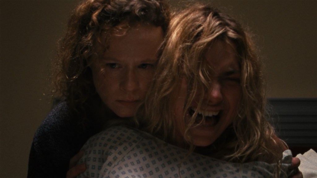 A cette période de sa vie, la seule façon d’exorciser le Mal c’est de se masturber pour essayer de trouver un peu de plaisir dans sa sexualité et surtout par défi (le visage en larmes, rageux, Imogen Poots irradie de fureur) ou bien de nager : elle fait partie de l’équipe de natation de son école et trouve un semblant de paix dans l’eau que ses addictions ne peuvent pas lui donner à long termes. Mais le « male gaze » n’est jamais loin : bien que peu présent à l’écran, le regard des personnages masculins reste pesant à chaque plan. Preuve en est : la scène de la pesée avant la compétition.